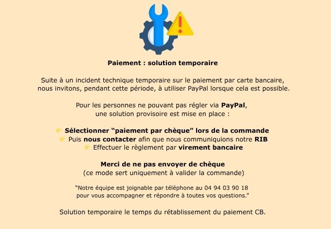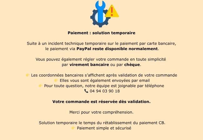 Les commandes passées le jeudi après 12h seront expédiées le lundi suivant