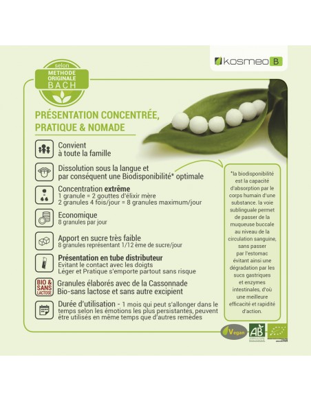 Depuis 1999, Kosméo s’engage à rendre les Fleurs de Bach accessibles à tous, avec une première innovation majeure : les granules sans alcool, respectueuses de la méthode originale du Dr Bach, adaptées à tous les publics, y compris les enfants, les personnes suivant des traitements médicaux spécifiques, ou encore les personnes ayant fait le choix d’éviter l’alcool pour des raisons personnelles, médicales ou spirituelles.