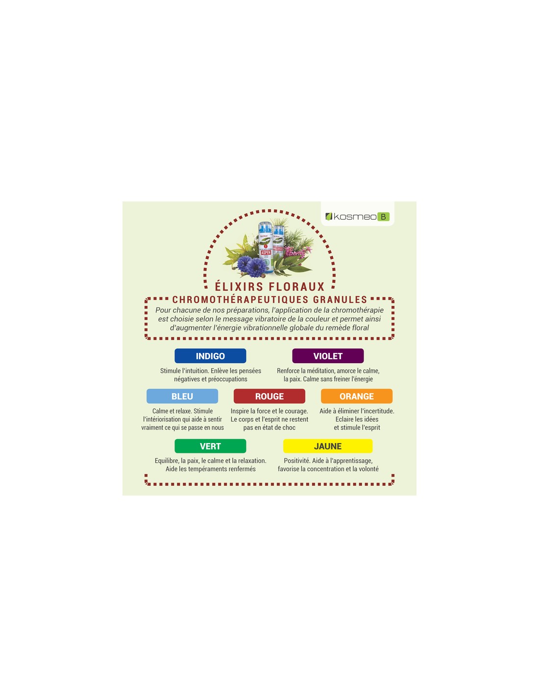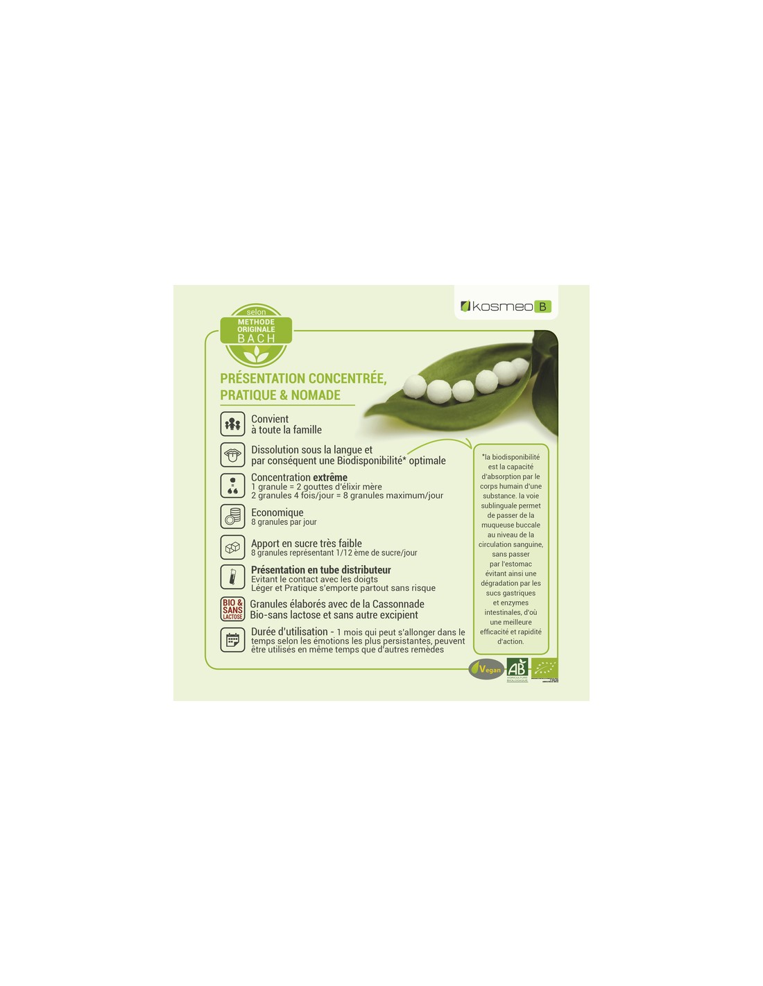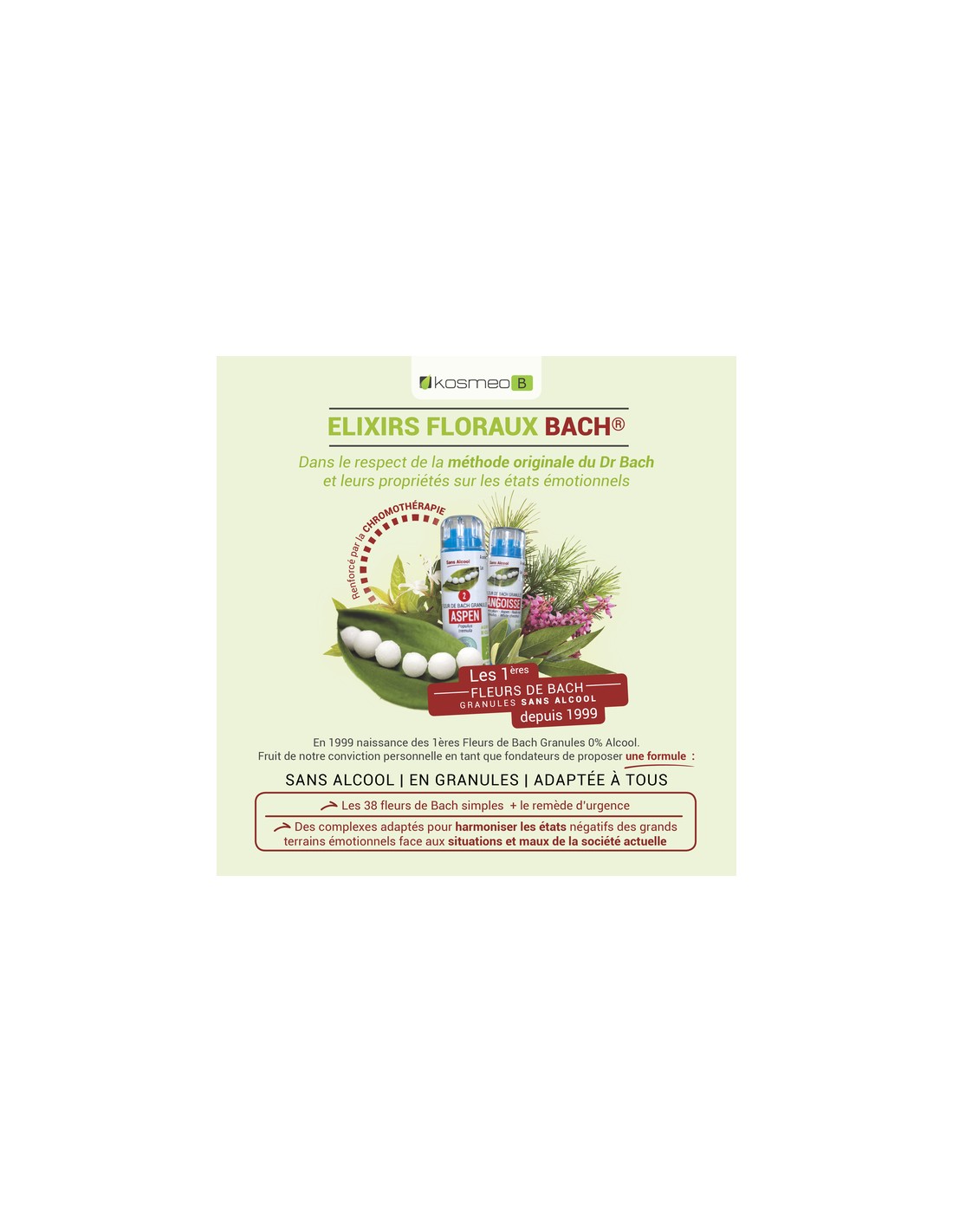 Depuis 1999, Kosméo propose une alternative naturelle, éthique et accessible : les Fleurs de Bach sans alcool sous forme de granules.