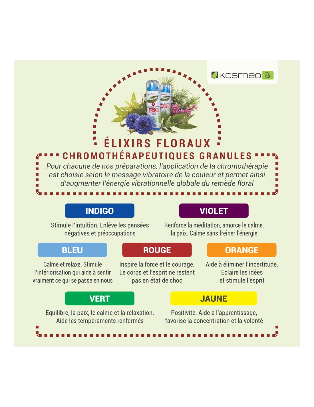 Les couleurs, issues de la lumière, agissent sur l’équilibre émotionnel. Chaque Fleur ou complexe est associé à une couleur vibratoire spécifique, augmentant la résonance énergétique du remède floral.